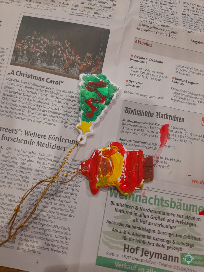 In der letzten Gruppenstunde der "Regenbogen Kids" am 19.12.2025 wurden Tannenbaumanhänger aus Gips kunstvoll gestaltet und ein Weihnachtsquiz absolviert. Anschließend fand im Freien eine Spielerunde "Fangen" statt.