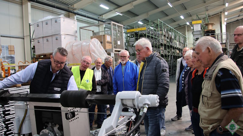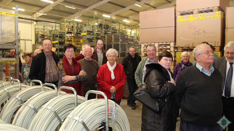 Bericht: Gerty Münstermann - Nach einer Fotopause am Schloss ging es durch die Bauerschaften Forsthövel, Rieht und Büren zur Firma Lancier Gable im Industriegebiet Drensteinfurt. Dort wurden die Teilnehmer von Geschäftsführer Thomas Oliver Vohl begrüßt. Ludger Wievelhove überreichte ein kleines Dankesgeschenk für die Betriebsbesichtigung. Anschließend zeigte Vohl eine Bildpräsentation zur Entwicklung des Unternehmens von der Gründung 1905 bis heute. Im Jahr 2002 übernahm die Firma die Entwicklung, Herstellung und den Vertrieb der Peter Lancier GmbH & Co. KG. Um das Know-how und die Erfahrung der Belegschaft zu sichern, wurden Teile des Personals in das neue Unternehmen integriert. Das Produktionsprogramm umfasst Kabelverlegesysteme, Verlegegeräte, Glasfaserverlegung, Kunststoffschiebebänder, Kabelziehstrümpfe sowie Trommelhub, -lagerung und -umspulung. Nach dem Vortrag führte Thomas Oliver Vohl die Gruppe durch die Produktionshallen und erläuterte die Abläufe von der Fertigung bis zur Produktvollendung. Abschließend dankte Gertrud Münstermann dem Geschäftsführer für die eindrucksvolle Präsentation und Werksführung.