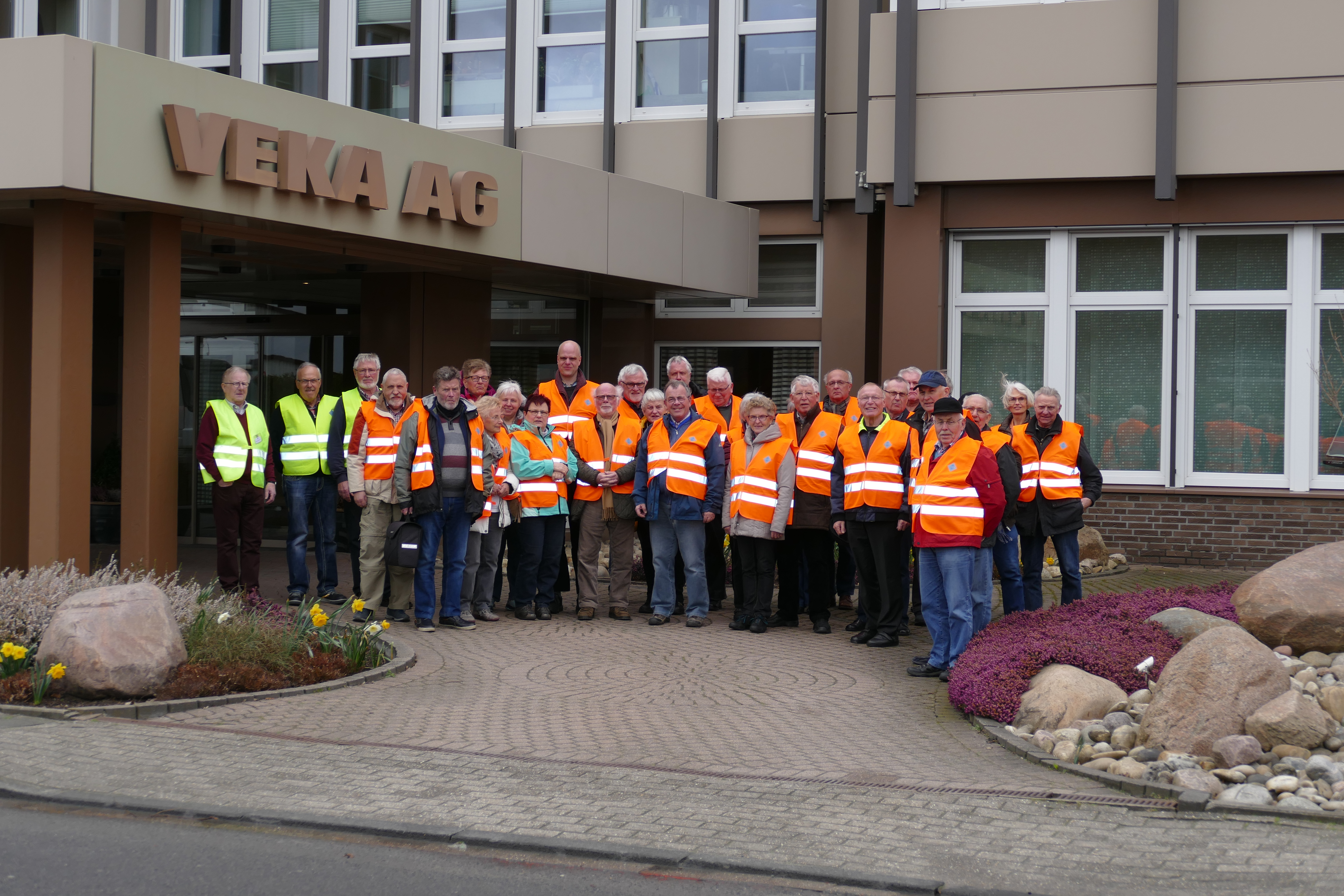 Bericht: Franz-Josef Naber - Am vergangenen Donnerstag fand die erste Pättekstour des Heimatvereins in diesem Jahr statt. Ziel der war die Firma VEKA AG in Sendenhorst. 11 Heimatfreunde fuhren trotz des regnerischen Wetter mit dem Rad und weitere 20 mit dem Pkw nach Sendenhorst. Die Gruppe wurde von Herrn Becklönne -Mitarbeiter der VEKA AG- begrüßt. Bei Kaffee und kalten Getränken stellte er die Firma VEKA AG vor. Die VEKA AG ist ein Produzent von Kunststoff-Profilsystemen für die Herstellung von Fenstern, Türen, Rolläden und Schiebetüren sowie von Plattensystemen aus PVC mit Werken in Deutschland , Großbritannien, Frankreich, Spanien, Polen, China, Russland und Nord –und Südamerika .Die Unternehmensgruppe beschäftigt aktuell 5600 Mitarbeiter weltweit, davon 1400 am Standort Sendenhorst. . Nach dem Vortrag erfolgte eine ausführliche und hoch interessante Betriebsführung durch ehemalige Mitarbeiter. Alle Teilnehmer waren sich einig, der Besuch der VEKA AG ein tolles Erlebnis war.
