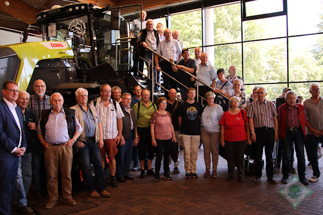 Bericht: Holger Martsch - Um 8.30 Uhr startete der Bus vom Landsbergplatz in Drensteinfurt nach Harsewinkel zum CLAAS-Stammwerk. CLAAS-Mitarbeiterinnen und -Mitarbeiter gaben ab 10 Uhr auf dem eineinhalbstündigen Spaziergang durch die Werkshallen auf unterhaltsame Weise aufschlussreiche Einblicke in Arbeitsablauf- und -organisation sowie alle Stufen der Produktion. In den Kabinen der schweren Traktoren mit Typenbezeichnungen wie „Xerion“ und „Axion“ konnte probegesessen werden, weiterhin gab es Hightech-Mähdrescher wie den „Lexion“ und „Tucano“ und Feldhäcksler vom Typ „Jaguar“ mit ihren bis zu 9 Meter breiten Schneidwerken im Besucherzentrum zu bestaunen. CLAAS als „global player“ mit 80 Prozent Exportanteil und modernen Werken auch in China, Indien, Russland und Ungarn – die Beamerpräsentation und der Unternehmens-Imagefilm gaben den Besuchern vielfältige Informationen zu dem in Harsewinkel beheimateten Weltunternehmen.