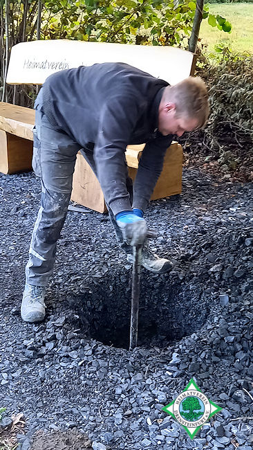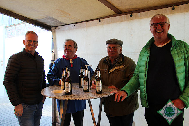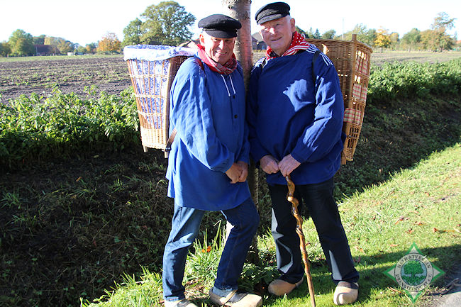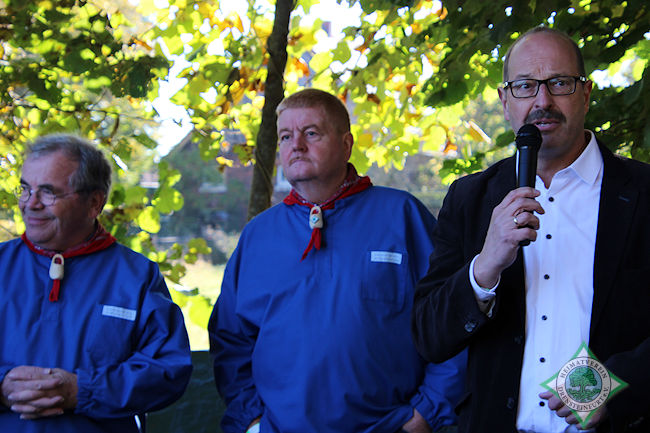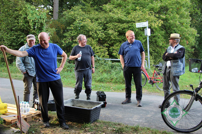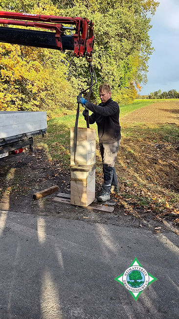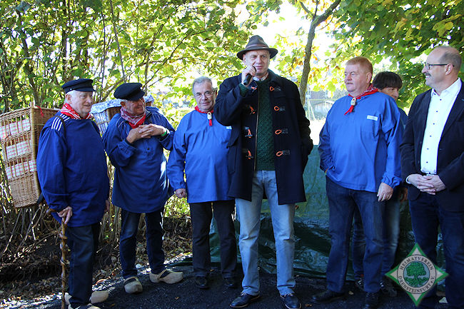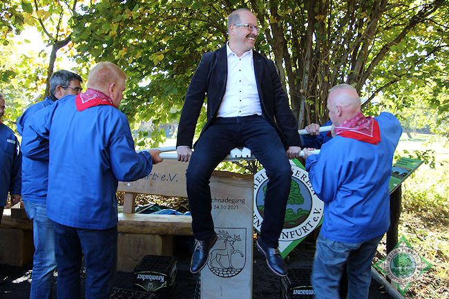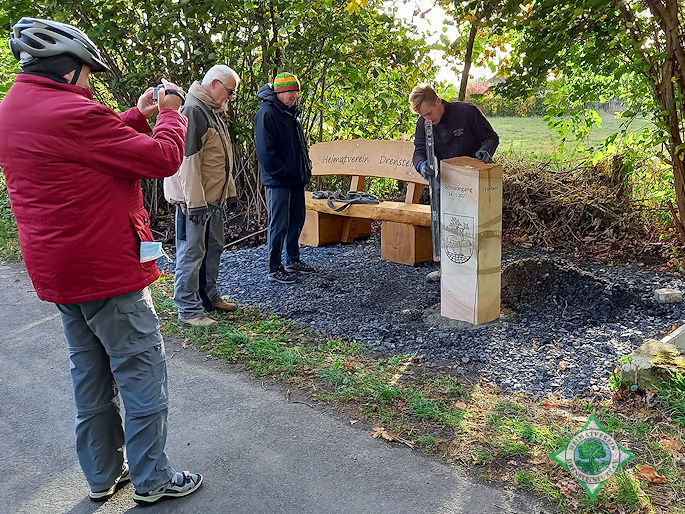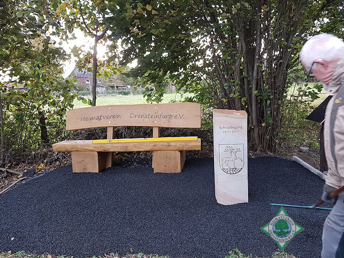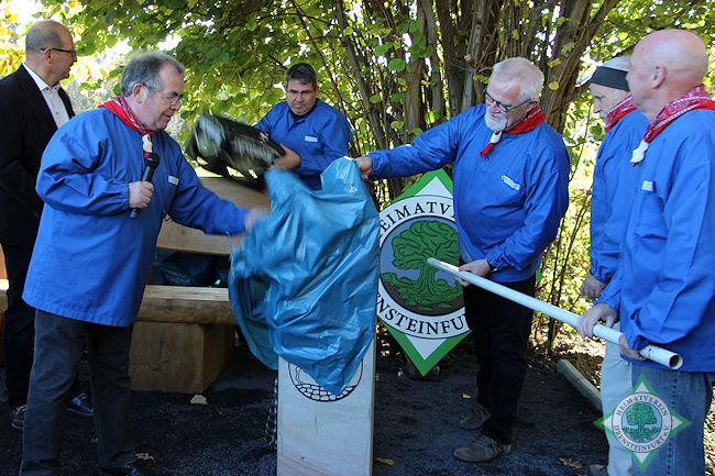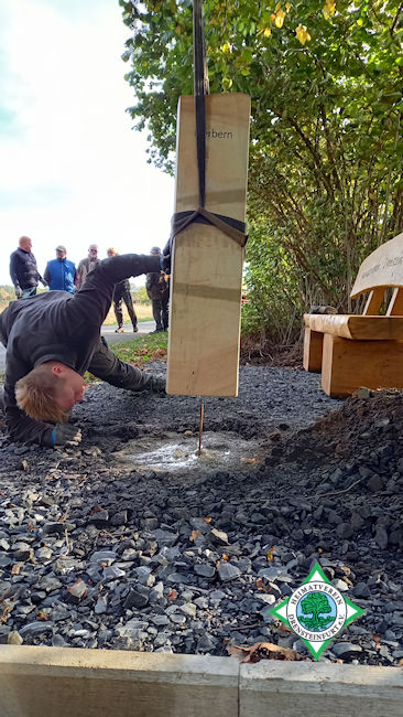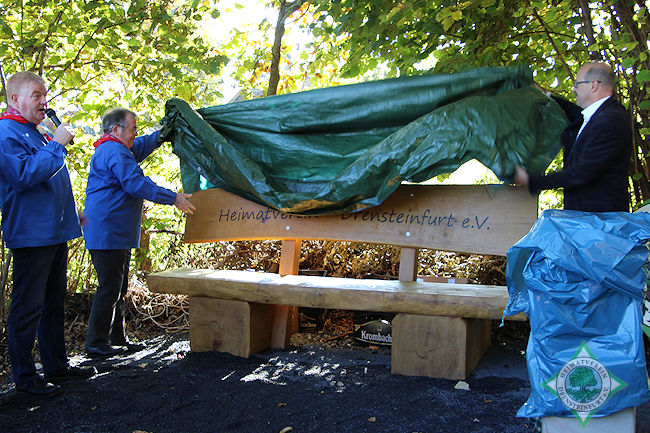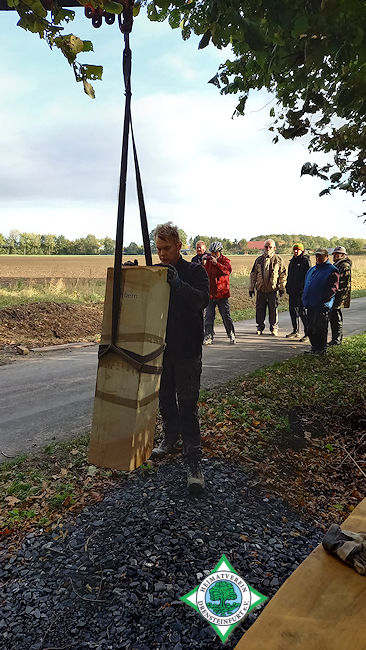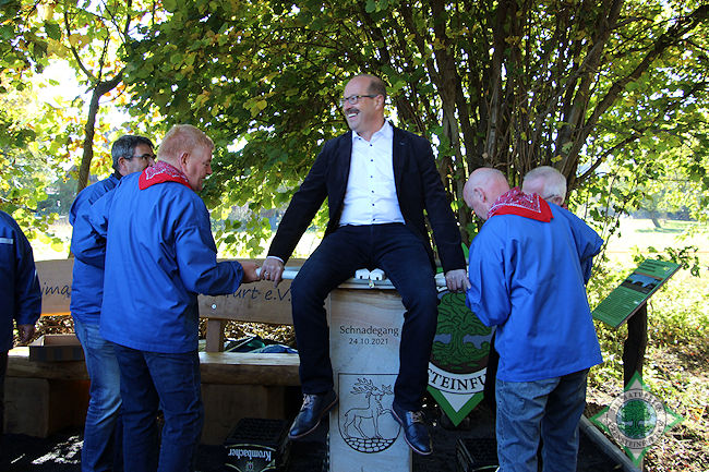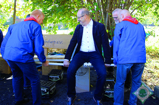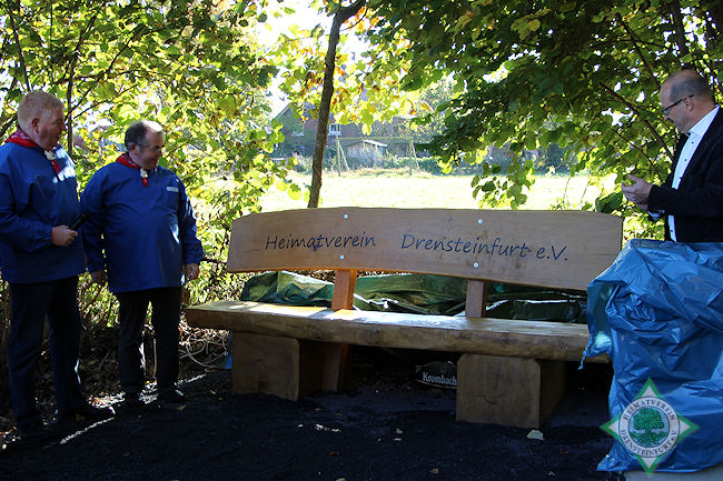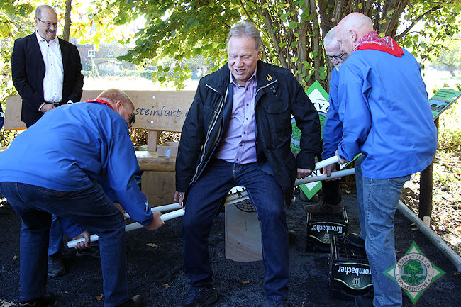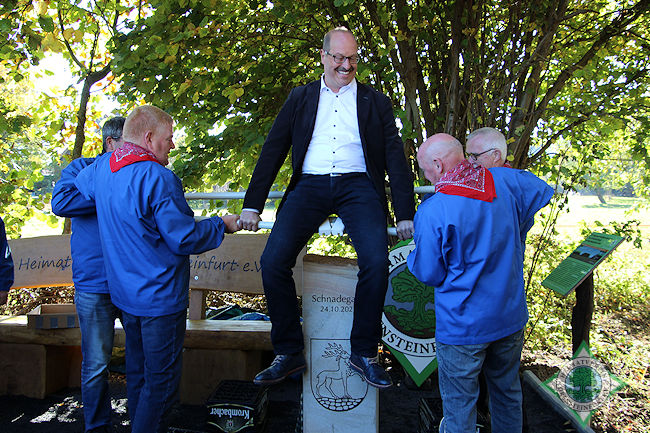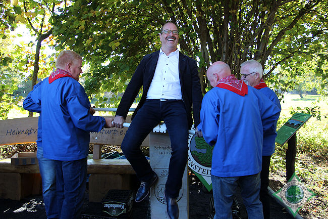 Der Herberner Josef Wernsmann, Mitglied im Vorstand des Westfälischen Heimatbundes, erinnerte in der traditionellen Tracht des Kiepenkerls an dessen Rolle, die seinerzeit der wichtigste Informationsträger gewesen sei. Damals habe es noch keine Zeitung gegeben, die erst ab etwa 1848 aufkam – etwa zur gleichen Zeit wie die Banken. „Der Kiepenkerl wusste wo es Geld zu leihen gab, wo Frauen im heiratsfähigen Alter lebten und wo eine Kuh verkauft wurde“, stellte er schmunzelnd fest. Steinmetzmeister Jens Herzog, der den Grenzstein aus Ibbenbürener Standstein hergestellt hat, meldete sich kurz zu Wort. „Es werden nur Menschen vergessen, die keine Spuren hinterlassen. Mir ist das hier gelungen“,teilte er fröhlich mit. Dann endlich läuteten die Jagdhornbläser den von vielen erwarteten Moment ein. Unter Trommelwirbel und dem Applaus der Zuschauer wurde Bürgermeister Carsten Grawunder von vier Mitgliedern des Heimatvereins auf Stöcken hochgehoben und einige Male auf den Stein aufgesetzt. Neben dem Grenzstein steht eine neue, aus massivem Eichenholz gebaute Ruhebank, angefertigt vom Holzkünstler Andreas Stentrup. Sie lädt Spaziergänger und Radfahrer zum Verweilen an der Grenze ein. Im Anschluss lud der Heimatverein auf den Hof Brüse/Gunnemann zum gemütlichen Beisammensein ein.
