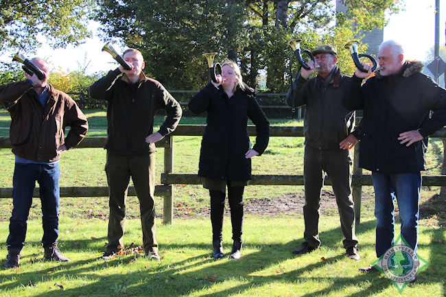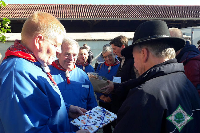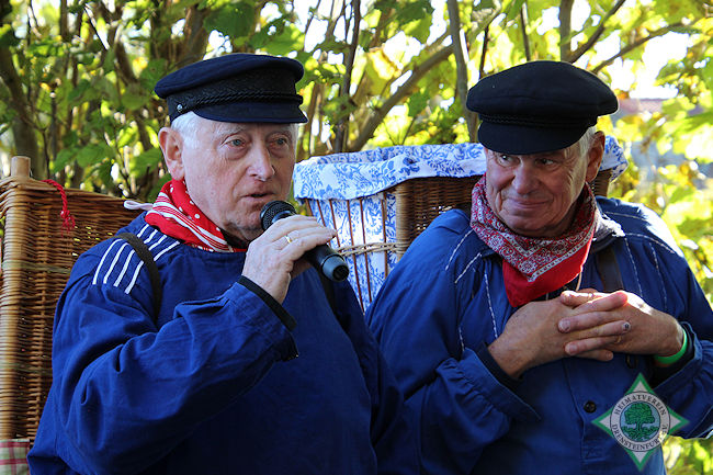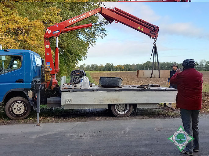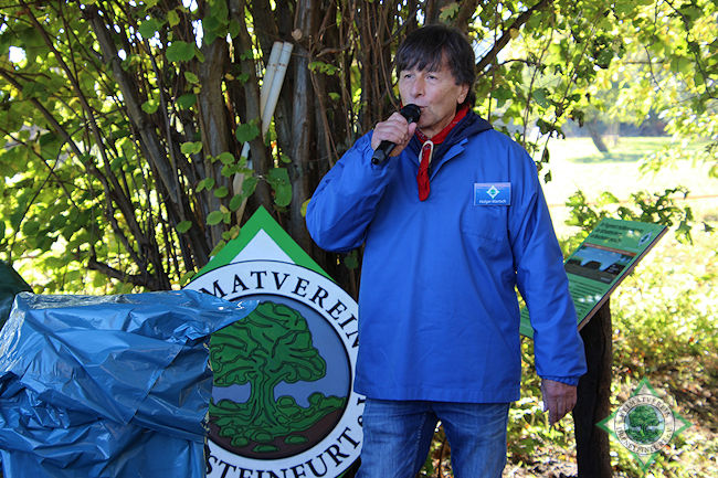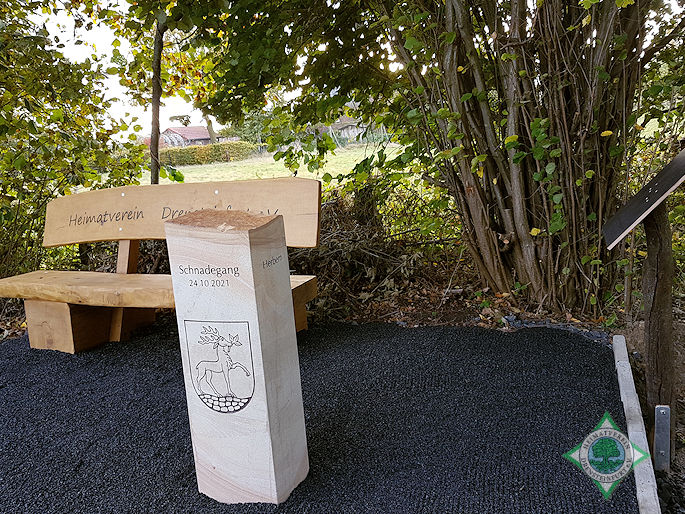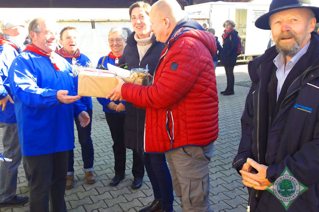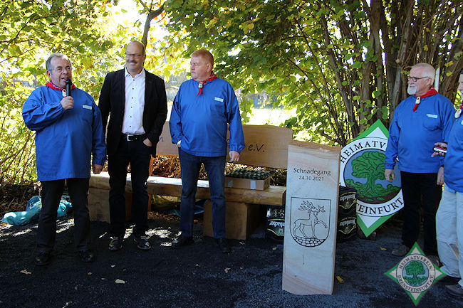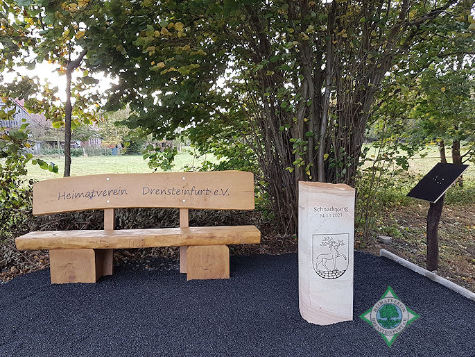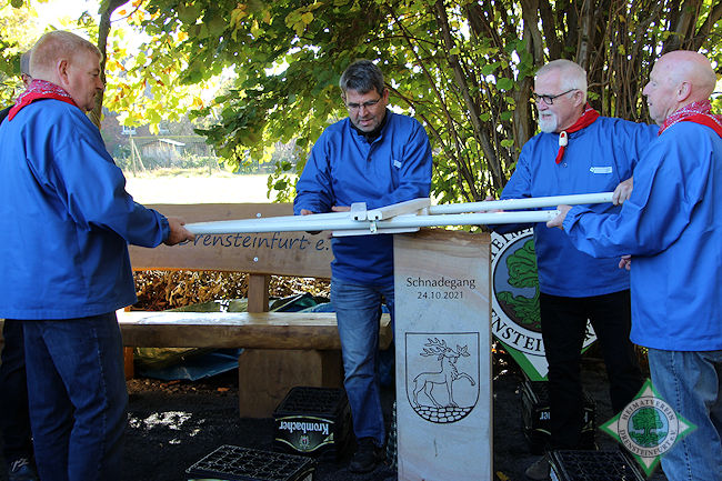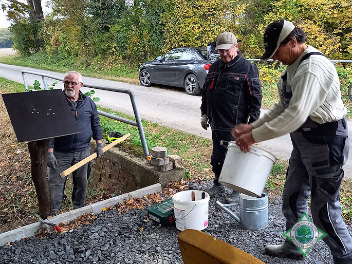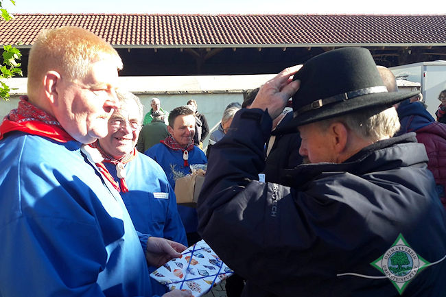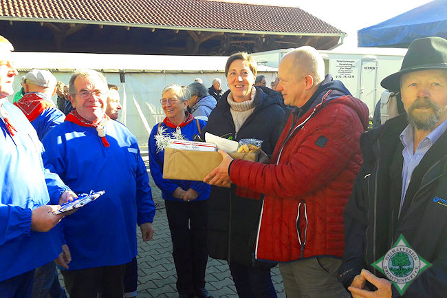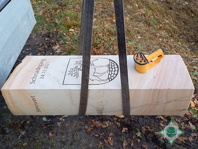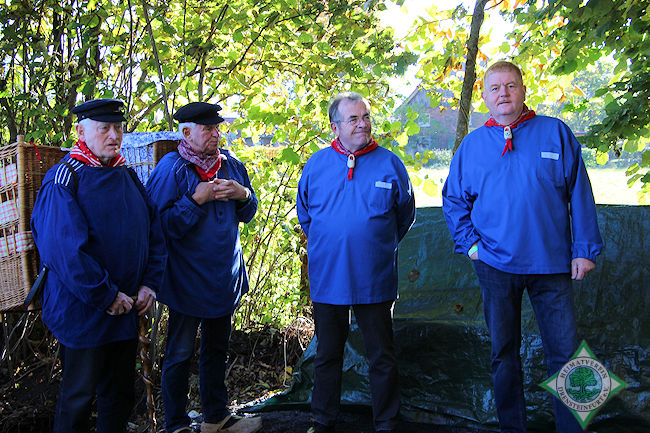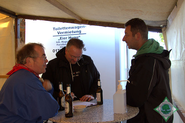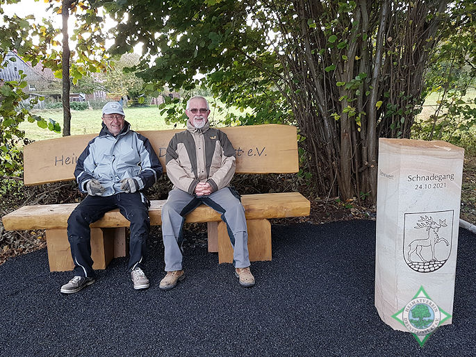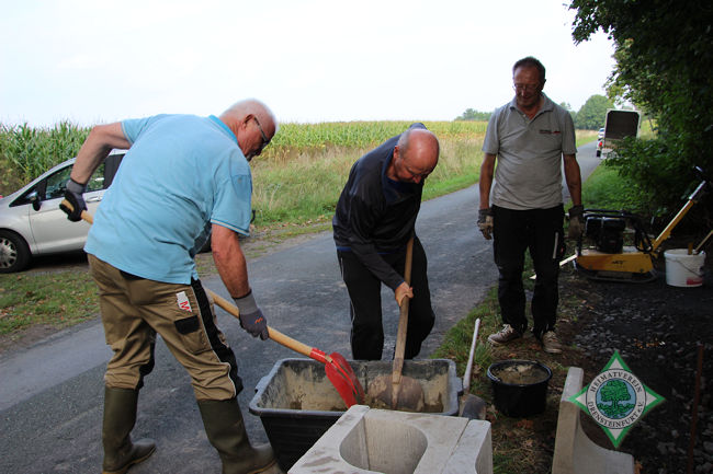 Der Herberner Josef Wernsmann, Mitglied im Vorstand des Westfälischen Heimatbundes, erinnerte in der traditionellen Tracht des Kiepenkerls an dessen Rolle, die seinerzeit der wichtigste Informationsträger gewesen sei. Damals habe es noch keine Zeitung gegeben, die erst ab etwa 1848 aufkam – etwa zur gleichen Zeit wie die Banken. „Der Kiepenkerl wusste wo es Geld zu leihen gab, wo Frauen im heiratsfähigen Alter lebten und wo eine Kuh verkauft wurde“, stellte er schmunzelnd fest. Steinmetzmeister Jens Herzog, der den Grenzstein aus Ibbenbürener Standstein hergestellt hat, meldete sich kurz zu Wort. „Es werden nur Menschen vergessen, die keine Spuren hinterlassen. Mir ist das hier gelungen“,teilte er fröhlich mit. Dann endlich läuteten die Jagdhornbläser den von vielen erwarteten Moment ein. Unter Trommelwirbel und dem Applaus der Zuschauer wurde Bürgermeister Carsten Grawunder von vier Mitgliedern des Heimatvereins auf Stöcken hochgehoben und einige Male auf den Stein aufgesetzt. Neben dem Grenzstein steht eine neue, aus massivem Eichenholz gebaute Ruhebank, angefertigt vom Holzkünstler Andreas Stentrup. Sie lädt Spaziergänger und Radfahrer zum Verweilen an der Grenze ein. Im Anschluss lud der Heimatverein auf den Hof Brüse/Gunnemann zum gemütlichen Beisammensein ein.