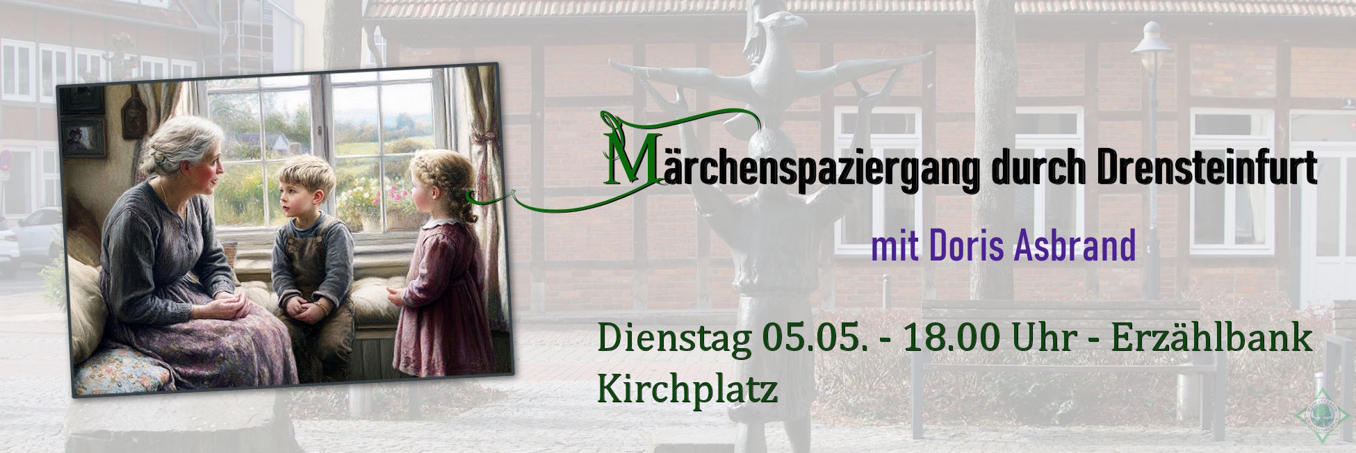 Dienstag, 05.05. - 18:00 Uhr Erzählbank Kirchplatz Märchenspaziergang zu den einzelnen Stationen mit Doris Asbrand