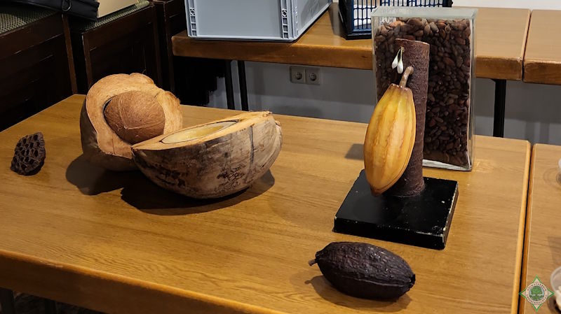 Es wurden Bilder der Blüten und Pflanzen von Früchten gezeigt, die ihren Ursprung nicht alle im europäischen Raum haben, z.B. die Seychellennuss oder auch „Coco de mer“ enthält den größten und schwersten Samen der Pflanzenwelt, wird über 20 kg schwer und hat einen Umfang von bis zu einem Meter. Ein Exemplar dieses Samens konnten wir bestaunen. Aber auch Zitronatzitrone, Citrus medica, Kakao, Papayafrüchte am Baum oder Cashewkerne wurden uns im Bild gezeigt. Cashewkerne, Korinthen, Rosinen und Sultaninen durften wir sogar probieren. Wir haben erfahren, dass eine Kokosnuss sehr gefährlich sein kann, wenn diese vom Baum fällt und einen Menschen trifft.