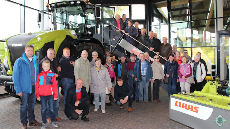 Bericht: Holger Martsch - Um 8.30 Uhr startete der Bus vom Landsbergplatz in Drensteinfurt nach Harsewinkel zum CLAAS-Stammwerk. CLAAS-Mitarbeiterinnen und -Mitarbeiter gaben ab 10 Uhr auf dem eineinhalbstündigen Spaziergang durch die Werkshallen auf unterhaltsame Weise aufschlussreiche Einblicke in Arbeitsablauf- und -organisation sowie alle Stufen der Produktion. In den Kabinen der schweren Traktoren mit Typenbezeichnungen wie „Xerion“ und „Axion“ konnte probegesessen werden, weiterhin gab es Hightech-Mähdrescher wie den „Lexion“ und „Tucano“ und Feldhäcksler vom Typ „Jaguar“ mit ihren bis zu 9 Meter breiten Schneidwerken im Besucherzentrum zu bestaunen. CLAAS als „global player“ mit 80 Prozent Exportanteil und modernen Werken auch in China, Indien, Russland und Ungarn – die Beamerpräsentation und der Unternehmens-Imagefilm gaben den Besuchern vielfältige Informationen zu dem in Harsewinkel beheimateten Weltunternehmen.