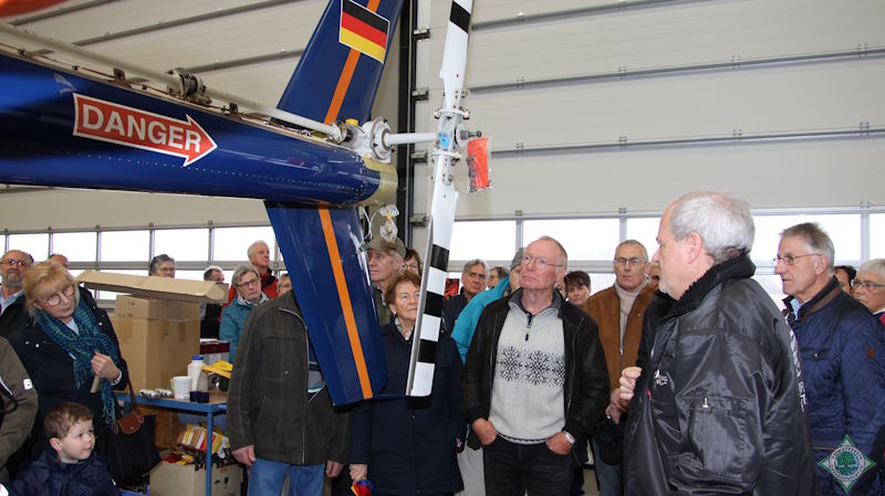 In der Halle sahen wir direkt auseinandergebaute Helikopter unterschiedlicher Größen. Bei Wartungen werden die Fluggeräte komplett auseinander genommen, geprüft, ggfls. repariert und wieder zusammengebaut. Das kann schon mal 3 Monate in Anspruch nehmen. Das Ersatzteillager weist mehr als 250.000 Teile auf, so dass die Wartung effizient und zeitnah durchgeführt werden kann. Unsere Fragen beantwortete Herr Stromberg gern.
