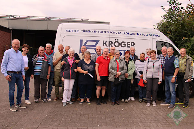 Gleich vor dem Beginn der Werksbesichtigung überreichte Ludger Wiewelhove ein kleines Präsent an Thomas Kröger und bedankte sich für die Einladung. In zwei Gruppen wurden die Teilnehmer/innen von Thomas und Alexander Kröger durch die Fertigung geführt. Die Fertigungshalle ist in verschiedenen Abteilen, wie Lager für die Fensterproduktion, Lager für fertige Fenster abholbereit für den Kunden, Fensterglas, Alubearbeitung und eine kleine Schreinerei eingeteilt. Zunächst sahen die Teilnehmer die Computergesteuerte Fertigung von Fensterahmen vom ersten bis zum letzten Arbeitsgang. Nachdem die einzelnen Produktionsabläufe bei laufender Produktion vorgestellt wurden, berichtete Thomas Kröger über die Geschichte des Unternehmens, das in Drensteinfurt als Stellmacherbetrieb begann. Mit dem Neubeginn 1973 in Ascheberg und der Spezialisierung auf das System Kömmerling verarbeitet die Firma Kröger Materialien für Türen und Fenster aus Aluminium, Kunststoff und Holz. Anhand einer PowerPoint Präsentation erklärte Thomas Kröger die weitere Entwicklung und die modernen Fertigungssabläufe im Unternehmen. Für die Produktion der Fensterfertigung wurde der komplette Maschinenpark im Jahr 2016 erneuert. Bei Kaffee und Kuchen war noch ausreichend Zeit für weitere Fragen, die Thomas Kröger gern beantwortete. Franz-Josef Naber, erster Vorsitzender vom Heimatverein Drensteinfurt, bedankte sich bei Familie Kröger für die Einladung, Beköstigung und den informativen Nachmittag in Ascheberg.