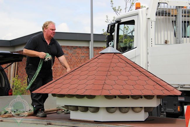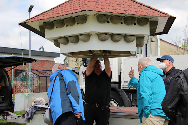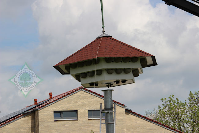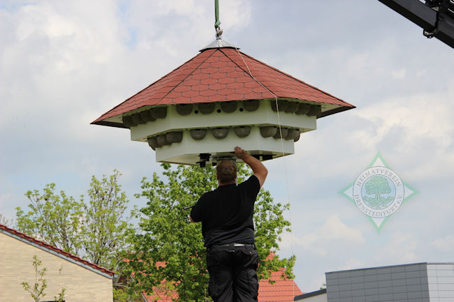 Ebenso passgenau setzte er das Haus nun in 4.50 Meter Höhe ebenfalls mithilfe des Krans auf die Stange und verschraubte sie. Zuvor hatten sich die Vorstandsmitglieder auf der Innenseite einer Abdeckung mit ihren Unterschriften verewigt.