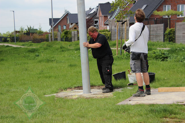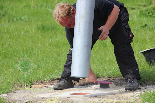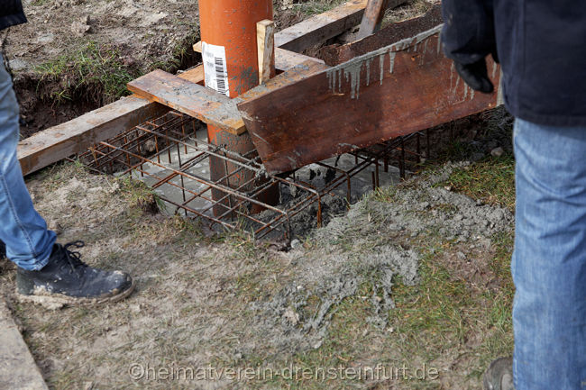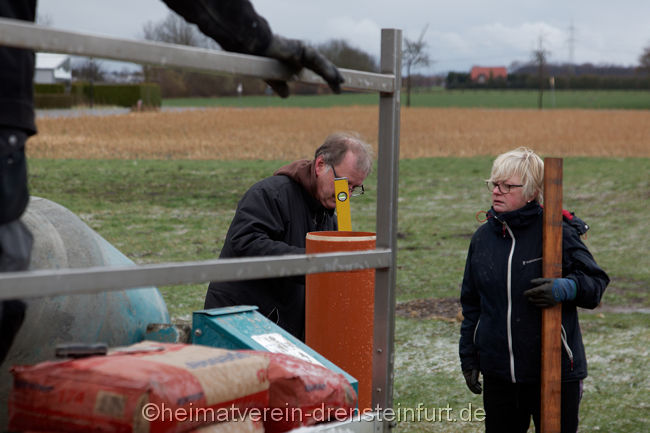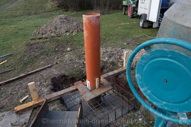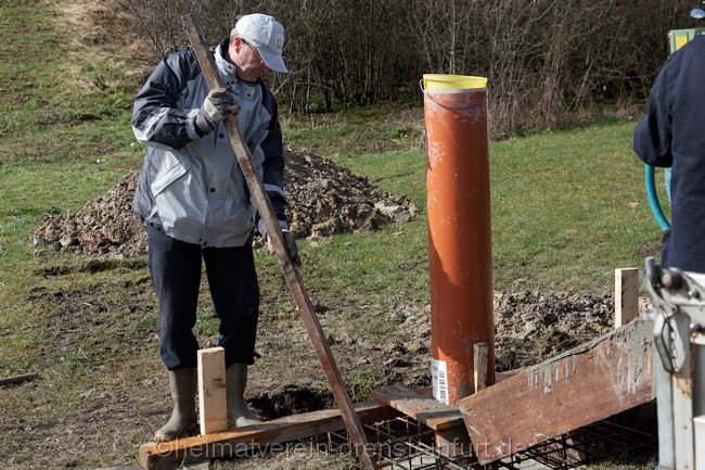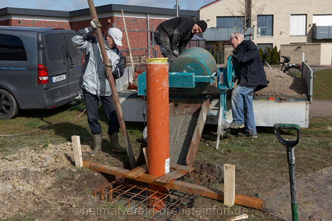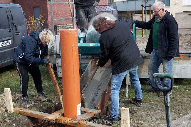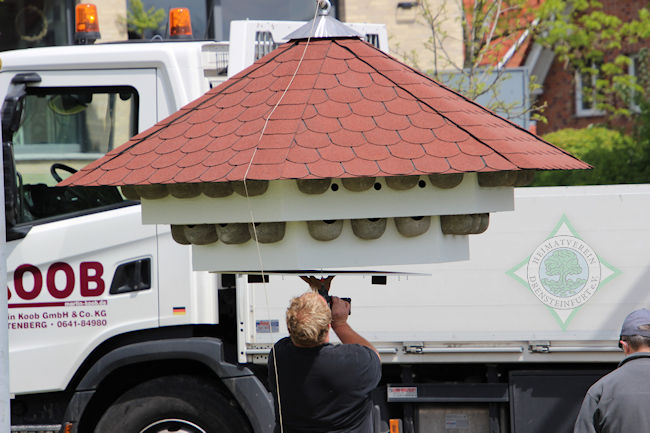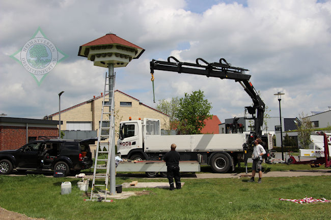 So verwunderte auch nicht, dass am Mittwochmittag, als das Schwalbenhaus aufgestellt wurde, jeder Handgriff passte. In relativ kurzer Zeit hatte Wegener das Rohr mit Hilfe des Autokrans in die vom Heimatverein vorbereitete Öffnung rund einen Meter tief im Boden eingelassen.
