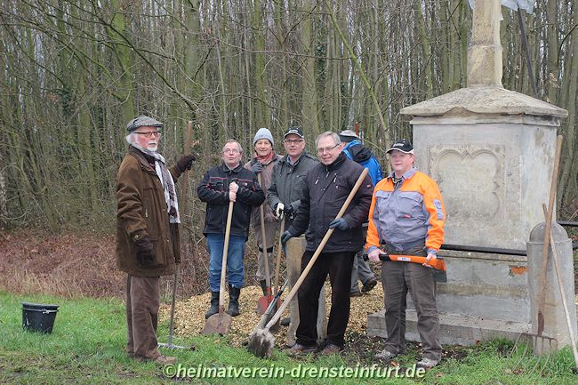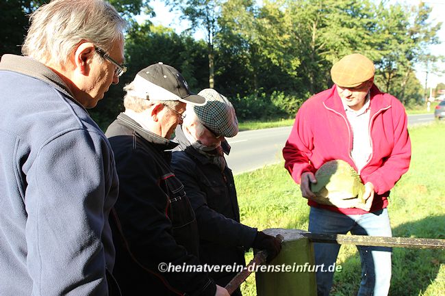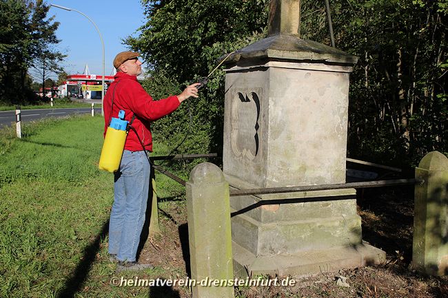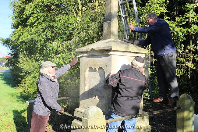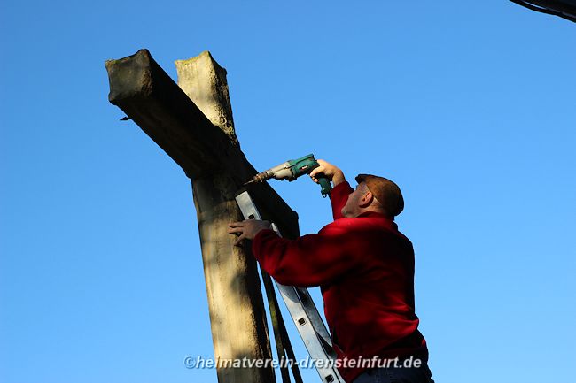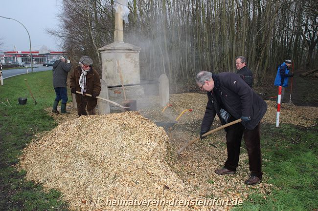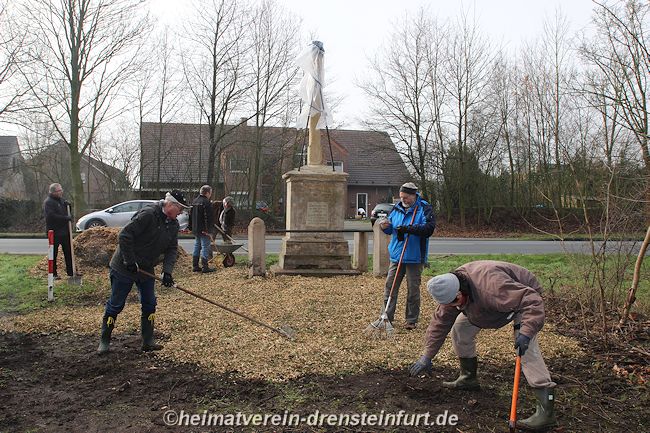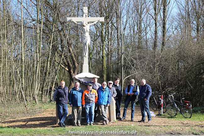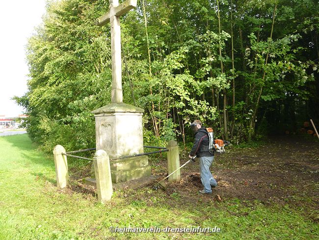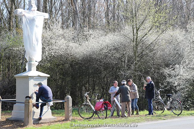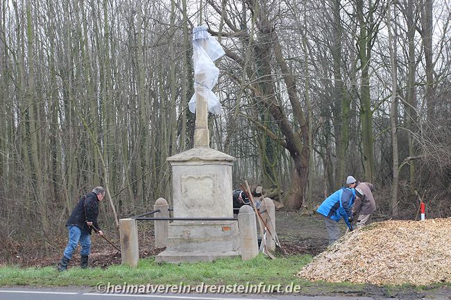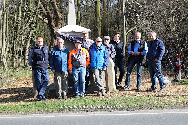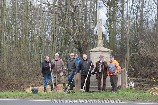 Aktive Heimatfreunde (Franz-Josef Naber, Norbert Unkhoff, Reinhard Bünningmann, Günter Koch, Manfred Blanke, Holger Martsch, Jens Herzog und Gertrud Münstermann) trafen sich am Wegekreuz um weitere Arbeiten zu erledigen. Holzspäne rund um das Wegekreuz wurden verteilt, sowie kleinere Baumwurzel die sich als hartnäckig erwiderten wurden mit einer Axt zerkleinert. und eben gemacht. Das Wegekreuz musste stabilisiert werden, wobei Jens Herzog zwei Bohrungen seitlich und oben im Stamm bohren musste. Hier setzte er zwei Gewindestangen ein, die er mit einen Festkleber fixierte. Das Wegekreuz Mittelstück wurde mit einem Steinfestiger eingestrichen und dem unteren Teil mit Sockel wurde mit Tiefgrund behandelt. Zum Abschluss wurde das Wegekreuz mit einer Folie abgedeckt, damit es bis zur weiteren Bearbeitung von den Wetterkapriolen geschützt ist.