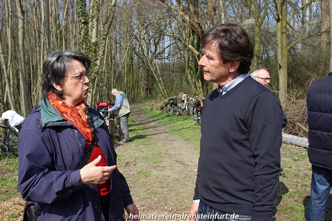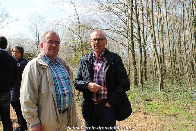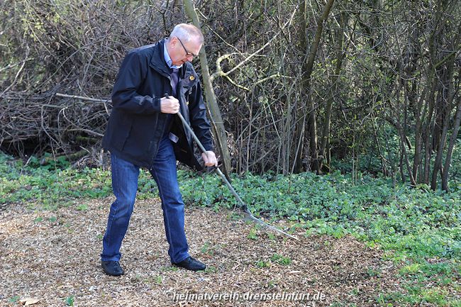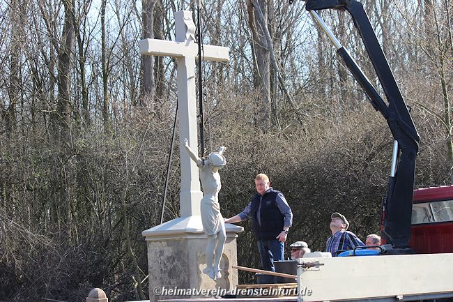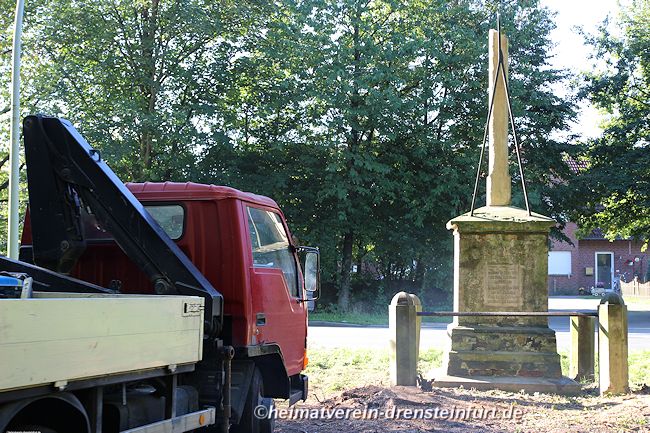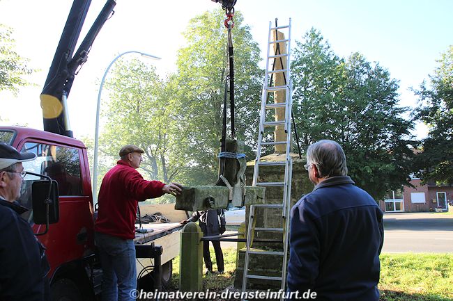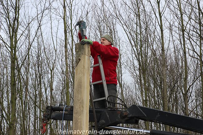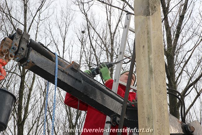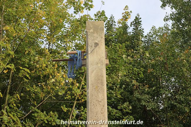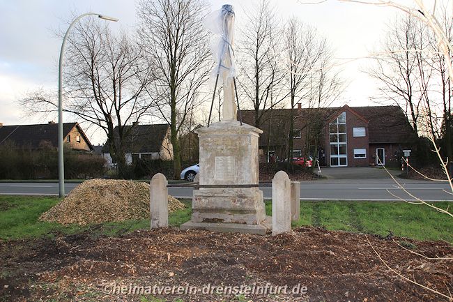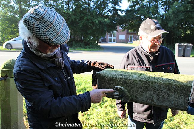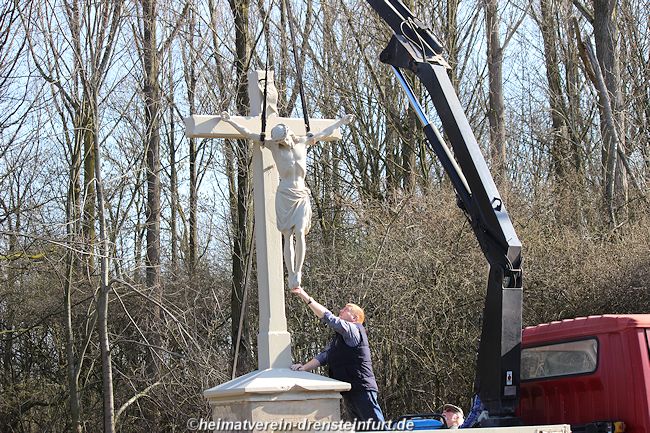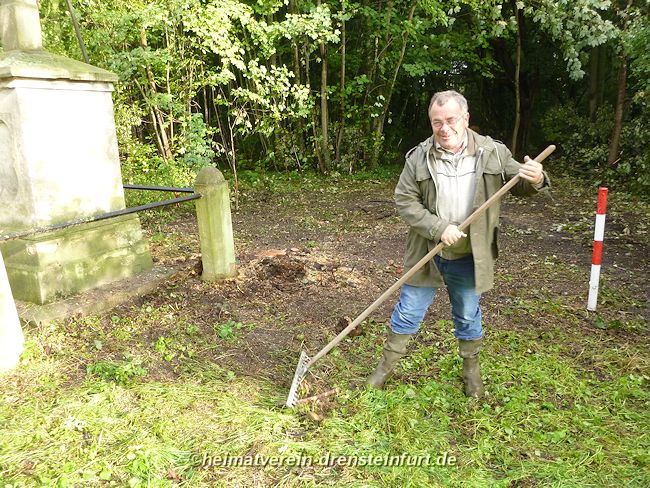 Aktive Heimatfreunde (Franz-Josef Naber, Norbert Unkhoff, Reinhard Bünningmann, Günter Koch, Manfred Blanke, Holger Martsch, Jens Herzog und Gertrud Münstermann) trafen sich am Wegekreuz um weitere Arbeiten zu erledigen. Holzspäne rund um das Wegekreuz wurden verteilt, sowie kleinere Baumwurzel die sich als hartnäckig erwiderten wurden mit einer Axt zerkleinert. und eben gemacht. Das Wegekreuz musste stabilisiert werden, wobei Jens Herzog zwei Bohrungen seitlich und oben im Stamm bohren musste. Hier setzte er zwei Gewindestangen ein, die er mit einen Festkleber fixierte. Das Wegekreuz Mittelstück wurde mit einem Steinfestiger eingestrichen und dem unteren Teil mit Sockel wurde mit Tiefgrund behandelt. Zum Abschluss wurde das Wegekreuz mit einer Folie abgedeckt, damit es bis zur weiteren Bearbeitung von den Wetterkapriolen geschützt ist.