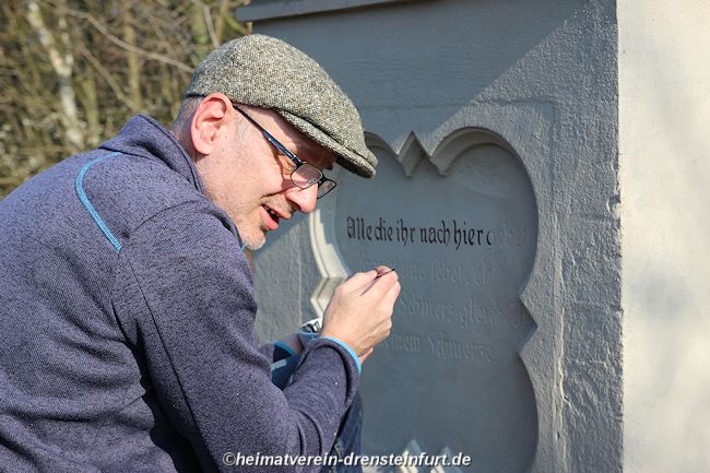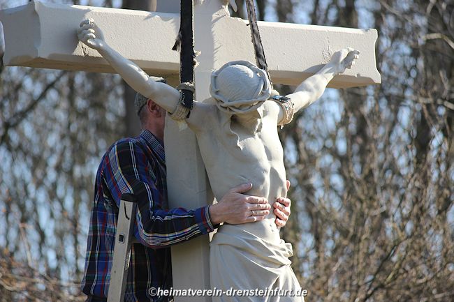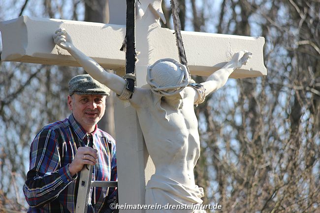 Die Nachzeichnung der Schrift in bräunlicher Farbe erfolgte durch Jens Herzog. Bereits am Vortag hatte er den Sockel im gleichen Farbton wie Kreuz und Korpus gestrichen. Die letzten Vorbereitungen, wie das Absperren der Straße, das Auflockern der Holzspäne und das Anbringen von Hinweisen auf die Veranstaltung, wurden am Samstag von den Heimatfreunden getroffen. Besonders hervorzuheben ist die hervorragende Arbeit von Jens Herzog, der das Wegekreuz und die Reparatur des Korpus mit großer Sorgfalt und Liebe zum Detail wiederhergestellt hat. Durch den Einsatz von Jens Herzog und Günter Koch ist das Wegekreuz aus seinem Dornröschenschlaf erwacht und erstrahlt nun in neuem Glanz. Für ganz Drensteinfurt bedeutet dies ein wiederbelebtes Wegekreuz von großem Wert.