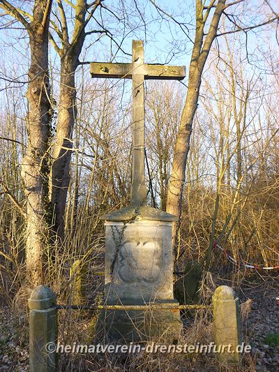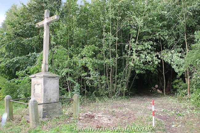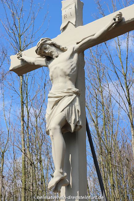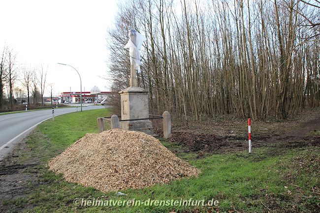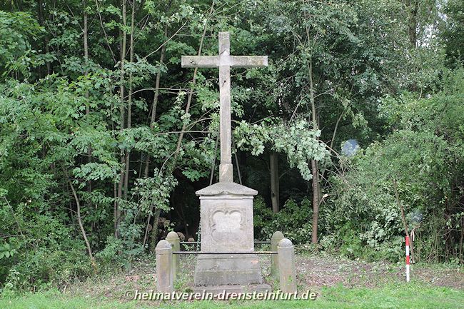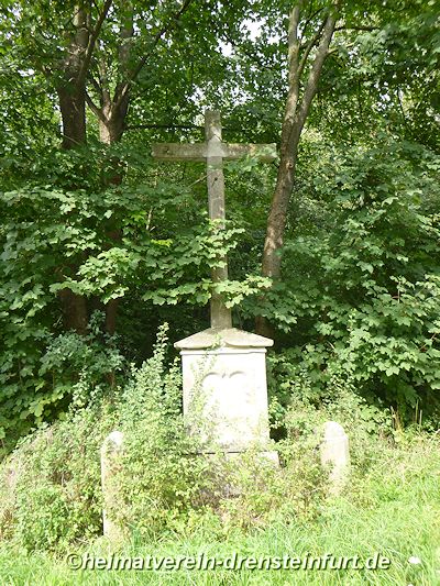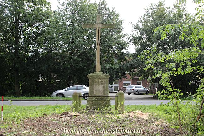 Das Wegekreuz aus Sandstein befindet sich an der Konrad-Adenauer-Straße am Rande eines kleinen Wäldchens. Die Inschrift und das Kreuz aus dem 18. Jahrhundert sind stark verwittert. Mit einem Traktor und einer Eisenkette soll der Korpus vor etwa 20 Jahren von Vandalen vom Kreuz gezogen und dabei in mehrere Stücke zerlegt worden sein. Einige Jahre lang lagerten diese Bruchstücke bei einem Steinmetz in Werne. Am 24. Juli 2015 wurden sie vom Vorsitzendenden des Heimatvereins, Franz-Josef Naber, Günter Koch und dem Eigentümer Manfred Schulze Pellengahr von Werne nach Drensteinfurt zurück geholt.
