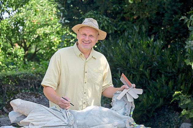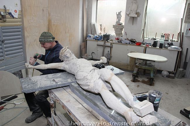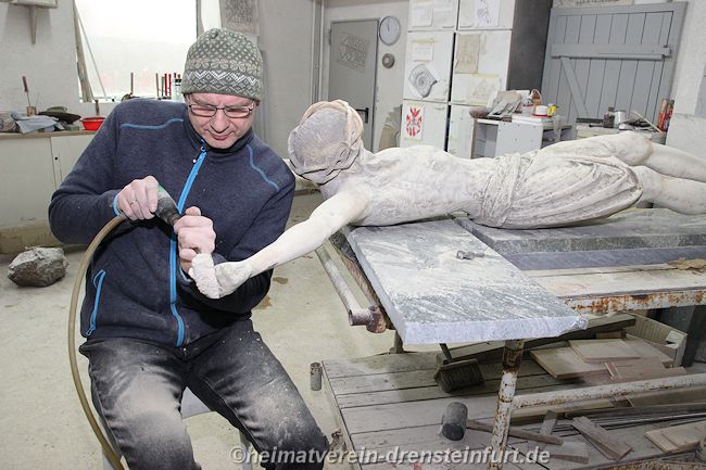Steinmetz Jens Herzog ist mit der Restaurierung der zerstörten Christus-Figur beschäftigt, die bald wieder den Bildstock „Pellengahr“ zieren soll. Foto: Holger Martsch