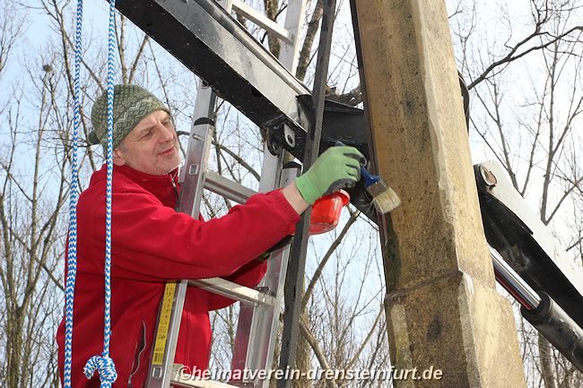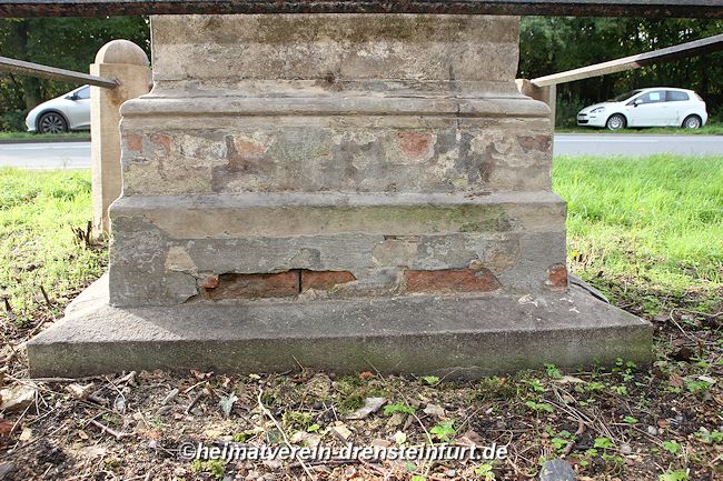 2026 - Der Sockel wies erneut Witterungsschäden auf. Risse wurden mit Mauermörtel gefüllt und abgelöster Putz abgetragen. Nach Abschluss dieser Vorarbeiten erfolgte ein kompletter Neuputz des Sockels. Abgeschlossen wurde die Maßnahme mit einem Schutzanstrich.