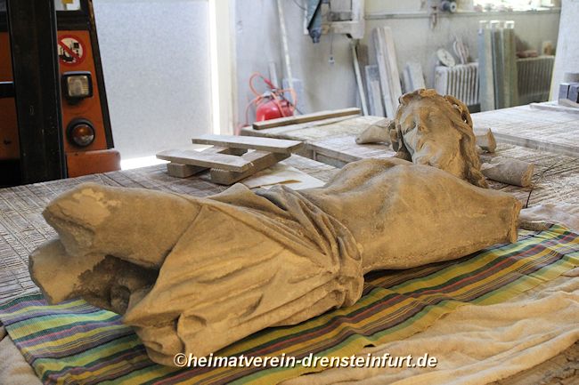 Der Steinbildhauer Jens Herzog, der sein Atelier in Drensteinfurt hat, wird die Einzelteile des zerstückelten Christus-Korpus jetzt wieder zusammenfügen. Er wird, voraussichtlich bis zum Frühsommer 2016, eine Komplettrestaurierung dieses Flurdenkmals vornehmen. Zur Einweihung des erneuerten Wegekreuzes, das momentan wortwörtlich ein Schattendasein führt, soll auch das Umfeld des Denkmals in einen ansehlichen Zustand gebracht werden.